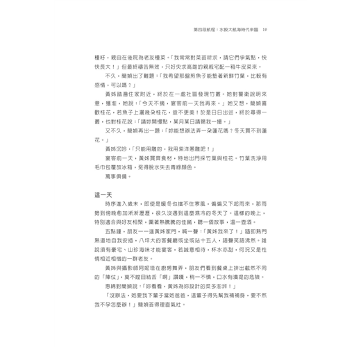本文錄自書中〈第七宴 我那粗勇婢女的四段航程─散文家簡媜的故事〉的「第四段航程:水餃大航海時代來臨」,簡媜自述的第四部分,藉由「水餃」,串起所謂外省人、本省人兩方面在食物的連結,告訴讀者:食,性也。由於食物,人與人之間是沒有任何隔閡的,且可能因為食物,使得人與人的關係由疏遠而更緊密。食物之功能,大矣哉。