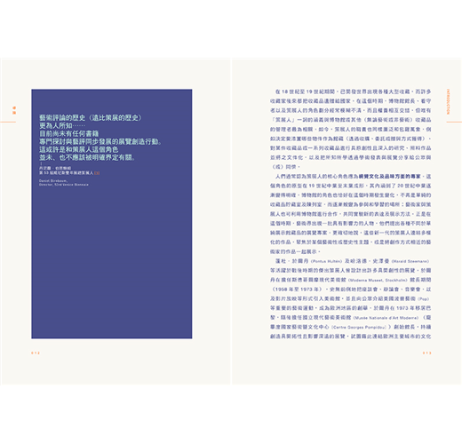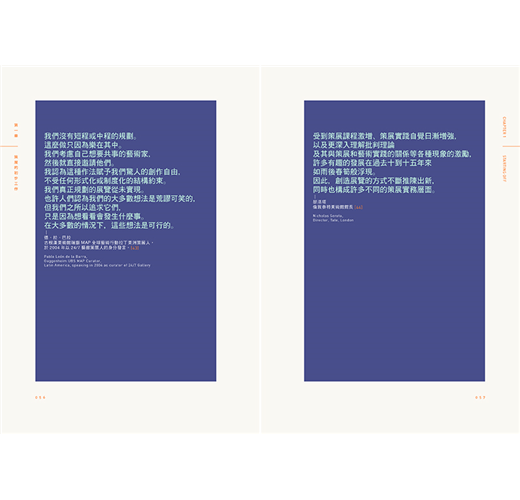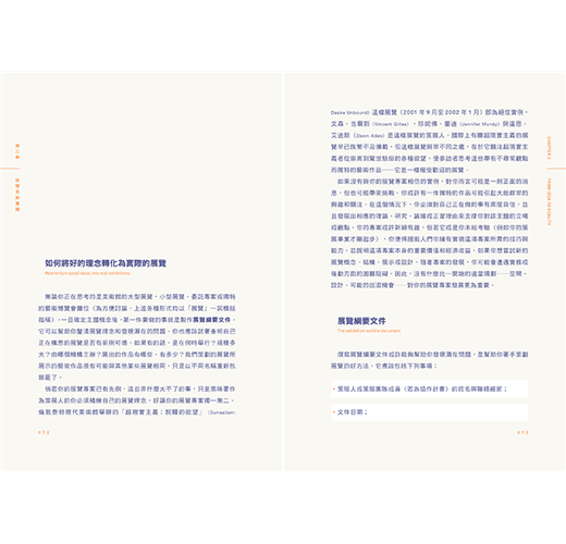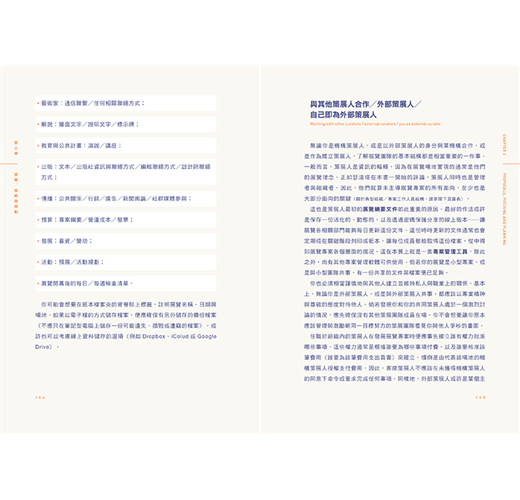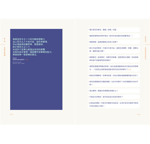 此外,書內亦特別以單頁設計、重點呈現了許多國際知名的博物館館長與策展人給予讀者如何在現今變動劇烈的藝術現場中工作的各方面資訊與建議。對於想要好好整理規劃自己的展覽事業、苦幹實幹的做一個真正的策展人的讀者來說,本書勢必可以提供關於策展最全面及完整的知識及訊息。