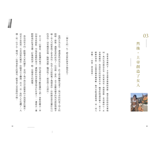 現在當我照著鏡子時,已經看不見過去那位少女的身影了,除了隨著歲月削瘦下來的雙頰,眼角不知何時開始,竟然也藏了幾根細紋。不經意間,好像變成了女人,但這個女人是不是過去自己嚮往的女人?我卻答不出來。