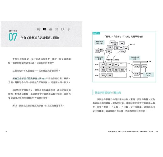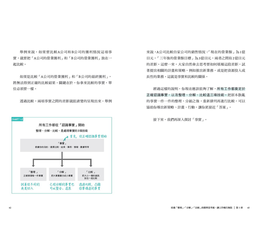 只要工作的四種基本活動──「聽」、「想」、「寫」、「說」的循環順利運轉,工作的效率、品質、精確度都能夠獲得提升。而這四種活動都需要針對事實進行「整理」、「分解」、「比較」。