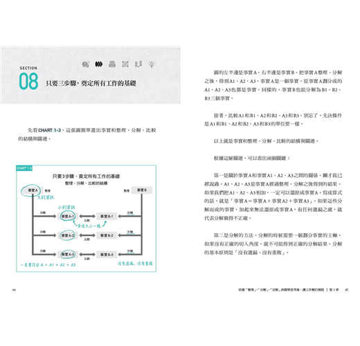 第1章要讓讀者了解,什麼樣的「事實」需要我們「整理」、「分解」、「比較」。我會舉工作上的常見實例,讓大家看到正確掌握「事實」有多麼重要。「整理」、「分解」、「比較」這些「事實」的技術,是簡單思考的基礎。