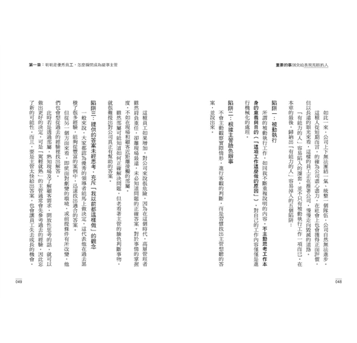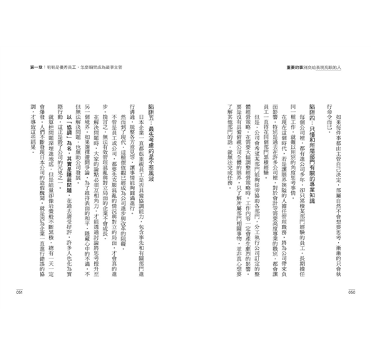 因此,我才會力勸大家要趁早擺脫掉這個陷阱。在本書裡,會為各位介紹「優秀員工」常常會掉進的陷阱和擺脫方法,而你從陷阱逃出的一小步,就會成為改變公司的一大步。