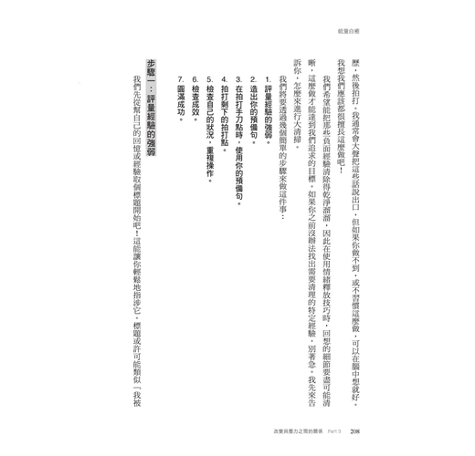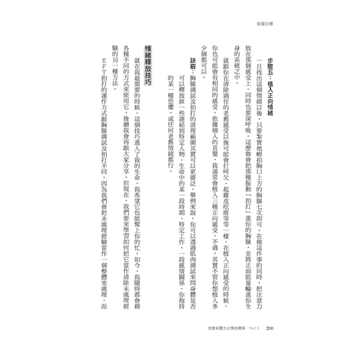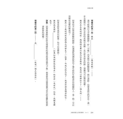練習及技巧一覽表 圖片一覽表 緒論:如何踏上這場旅程 第一段:介紹能量體及自癒 第一章:我的成功故事 第二章:接觸身心靈療法 第二段:經考驗證實有效的自癒流程 Part 1:臣服、接受、流動 第三章:是時候臣服了 第四章:創造堅實的自癒基礎 Part 2:找出能量堵塞 第五章:從潛意識獲得答案 第六章:學習身體的語言 Part 3:改變與壓力之間的關係 第七章:清除未處理經驗 第八章:釋放有害的信念 第九章:轉化不健康的情緒模式 第十章:找出真正的恐懼 第三段:最後的訣竅及鼓勵 第十一章:創造一張專屬於你的自癒地圖 第十二章:繼續前進 讀書會上可以討論的問題 其他資源