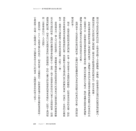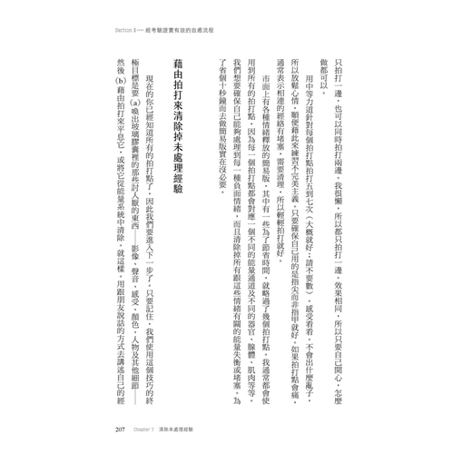 如何踏上這場旅程 想像你是一棵美麗的龐然大樹,擁有巨大又強壯的樹幹,樹根深紮入地,樹枝伸向天空。有一天,你發現情況不大對勁,你的樹葉變得脆弱易碎,滿是小洞;你的樹枝沉甸下垂。自我觀察過後,你找不到任何造成身體變化的明顯原因。你立刻陷入恐慌,開始更細心照顧自己的枝葉。你在枝葉上灑了更多水,也噴了藥物,還做了很多其他的事,但情況卻沒有改善。你所看見的那些樹葉其實只是問題的表象。 樹下的土壤代表了你的根基。問題出在土壤。土壤才是你的本核,土壤是對你造成影響的事物的總和。混有石塊與垃圾的土壤將會影響到樹的每一個部位。土壤裡的每一樣東西都成了你的一部分。 樹根代表了能量系統及通道。如果土壤裡充滿了不協調──就如一棵樹底下的土壤可能充滿了帶來環境壓力的因素──那些樹根就會因為土壤的關係也變得不協調,進而影響到整棵美麗的樹。或許這樣的影響從樹根傳到枝葉需要花點時間,或許甚至要好幾年。但早晚都會發生。樹葉代表了你的器官、腺體、肌肉、身體系統、化學物質跟荷爾蒙。等到你發現樹葉變得易碎又有小洞時,你沒有辦法透過直接治療樹葉來恢復樹木的健康。光噴藥解決不了問題。照顧樹葉不是真正的治療方法。得要深入土壤,改善樹木成長的根基。你必須要回過頭去發現真實的自己,清理掉那些毒害根基的老舊能量。你得要把土壤清理乾淨才行。 這本書將如何幫助你 要駕馭自癒力的最大阻礙是不知從何下手──換句話來說,就是不知道應該要怎麼做。無論你是覺得情緒失調,或那些失調已經影響了你的健康狀況都一樣。 我將在這本書裡面引導你,讓你知道應該如何自癒。你將學會清理土壤的方法,所依照的方式不僅對我來說有用,對其他幾百個人也同樣有用,我已經透過一場又一場的療程證實了這件事。並非一定要生病了才能使用這本書。 事實上,這本書無關疾病,而是關於情緒與能量。任何人都一樣,如果能夠讓情緒與能量平穩下來,身體就會覺得更舒坦。記住,清理土壤是我們的最終目的,是你唯一的目標。將土壤清理乾淨,你的人生就會改變。 市面上有數不清的能量治療技巧,但多數都需要有另一個人從旁協助。在這本書中,你將學會一些自己一個人就能施行的技巧,也是我用來自癒時所使用的。其中有一些是我在踏上自癒之旅時學會的,有一些則是我自己發明的。所有這些技巧都將在這場旅程中賦予你滿滿的力量。使用或練習這些技巧時,你不需要仰賴另一個人的幫忙。只要靠你的雙手就行啦,寶貝! 你將學會幾個改變你與壓力之間的關係的主要技巧: • 胸腺測試及拍打 • 情緒釋放技巧(Emotional Freedom Technique,簡稱EFT) • 情緒清掃 • 脈輪拍打 • 三心法 除了三個主要技巧之外,你也將學會其他能幫助你繼續踏上自癒之旅的其他技巧。你可以在本書前面的地方找到一份包含所有練習及技巧的一覽表。教導你這些技巧時,我會給你明確的指示。這是我跟你溝通這些想法的唯一途徑。 不過,如果你覺得這些指示比較接近建議,相信我,你會從中獲得許多益處。如果你覺得有股力量要你用稍稍不同的方式去施行這些技巧,那麼就照那麼做。那個方式很有可能比較適合你。 針對每一個我學會的技巧,我都會稍加修改,加上一點「艾咪式調整」。如果你也想如法炮製,我允許你發揮自己的創意。在使用這些技巧來自癒時,我調整的部分包括用右手取代左手、做的時間比規定長或短一些、跳過一部分的練習等等。怎麼改動都沒關係。我在教導客戶或自己使用時的每一個技巧,都跟之前別人教我的有些許不同。 隨時都要記住,不管你使用哪種技巧去清理能量堵塞,找到要清理的目標比使用何種能量清淤技巧更重要。我們將在這本書裡一起找出不同的尋找能量堵塞的方法。這不但是最有效率的做法,也能讓你用不著去擔心每個清淤技巧都要做得完美無瑕。一旦找到堵塞的地方,你就可以自由透過任何正在使用的能量治療方法,從各個角度去清理掉那些淤積。 如何使用這本書 這本書分成幾個部分。一部分是找到自己的能量堵塞,一部分是如何清理,剩下的部分則是故事、思維,以及一些在你自癒的同時,能讓你的靈魂充滿能量的案例。這些真實的案例都是來參加療程的顧客主動跟我分享的故事,或是同意讓我轉載。但為了保障個人隱私,每個客戶的姓名及可供識別的細節都已經過徹底的變動。 其中的許多故事都是我人在印度時得知的,這些故事令我終生受用,因此我希望在你踏上自癒的旅程中,能夠把這些故事分享給你。 我勾勒出了許多不同的事例,讓你得以自行探索,幫助你能夠擁有一個健康的身體,同時擁有一個更快樂、更知足、更平靜的人生。或許你會覺得自己要做的事情很多,而事實也可能如此。但你做得到,而且我們沒有時間限制。腳步放輕鬆,我的朋友。別對自己太嚴苛。 瞭解我所用的方法最有效的方式,是按照本書的順序從頭到尾閱讀、學習、練習。這是吸收能量療法的全貌、概念及技巧的最佳方式。等到讀完整本書,你就會對我的方法有深刻的理解,或許接著還會依自己喜歡的順序翻閱本書,繼續學習。除了用自己的步調去閱讀跟練習之外,也歡迎你去找其他對此有興趣的人,這樣你們就能互相支持。 我在自癒時是徹底孤單一人,心裡常希望能有一群想法相近的朋