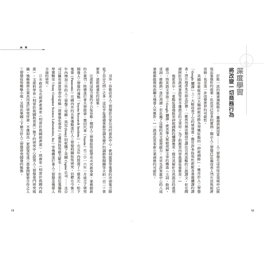 電腦具備自主學習及判斷能力的事實將對人類社會產生重大衝擊,本書不只以一般人能理解的方式說明人工智慧在技術方面的進展,更以大量的實例,說明目前全球各種規模的企業如何利用會「學習」的電腦,來改變企業的運作。例如客戶服務的工作,原本極為依靠人力,但是,現在只要投入大量過去的QA,電腦會自己學會如何對應客戶;如語文的翻譯,電腦也可以自己由大量的翻譯資訊中學習,讓翻譯的品質提升。