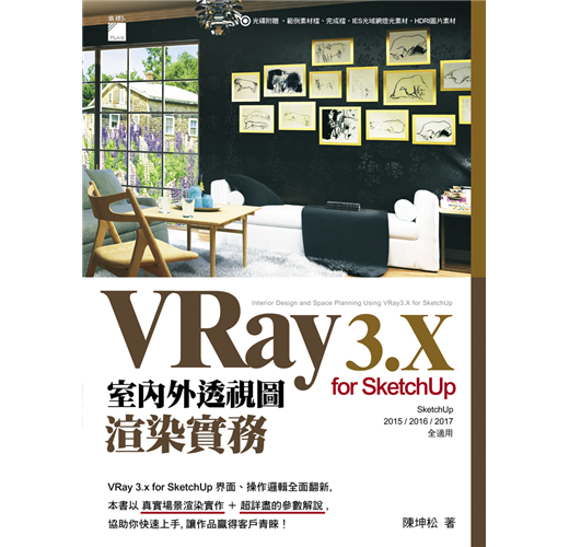 Vray for SketchUp 可以高效率製作超擬真的室內外透視圖, 是業者設計師最常使用的建模 + 渲染手法。不過對於新手來說, VRay 的參數欄位設定實在非常繁複, 新版 VRay 3.X (本書以 V3.4 說明) 更將使用界面與操作邏輯全面翻新, 對新手、老手來說都是學習的一大挑戰。