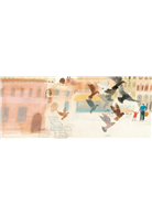 拿到這本書,看著作者寫在封面上的文字「獻給每一個必須在陌生之地找到家的小孩」,對於此刻的我而言,這是多麼令人動容的文字呀,只有經歷過飄泊才會知道這一份禮物有多珍貴。文中的孩子搬到了總是下著雨的英國,但心,卻留在充滿陽光、噴泉和奶奶店裡香草冰淇淋味道的羅馬。相對於現實生活中陪伴著他的鴿子,插畫家羅拉.卡爾琳很有智慧地用極淡的筆觸畫下孩子朝思暮想的羅馬,充滿著金色陽光,就像每一個思鄉人般,在想念之中,故鄉總是那麼般溫暖而美好。光是溫柔的畫風,就已經深深觸動孩子的心弦,讓二個孩子忍不住一頁又一頁地細讀下去。