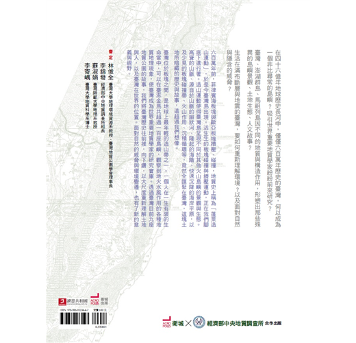 名人推薦:經濟部中央地質調查所 合作出版 推薦 王鑫 臺灣大學地理環境資源系名譽教授、哥倫比亞大學經濟地質系博士 林俊全 臺灣大學地理環境資源系教授、臺灣地質公園學會理事長 江崇榮 經濟部中央地質調查所所長 專文導讀 陳文山 臺灣大學地質系教授 王文誠 臺灣師範大學地理系教授