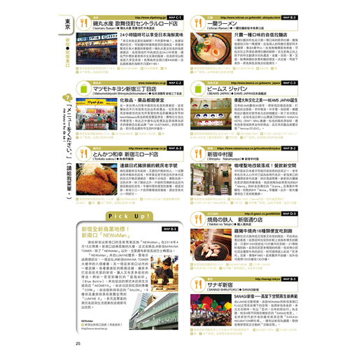 除了地鐵站的店家之外,書中還穿插了許多小專欄,包括「新宿全新商業地標!新南口『NEWoMan』」、「東京最大!MEGA唐吉軻德澀谷旗艦店開幕!」、「CONVERSE新型態概念店 White atelier BY CONVERSE」、「BUNKA HOSTEL TOKYO:文化用住的來體驗!」、「銀座四丁目新地標GINZA PLACE」……裡面吃喝玩樂的情報眾多,千萬不可錯過喔!