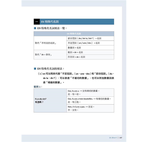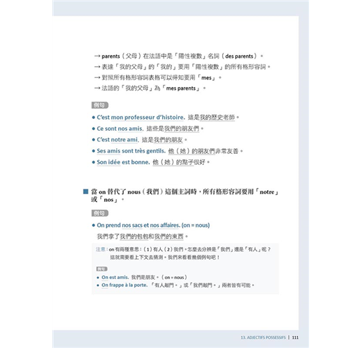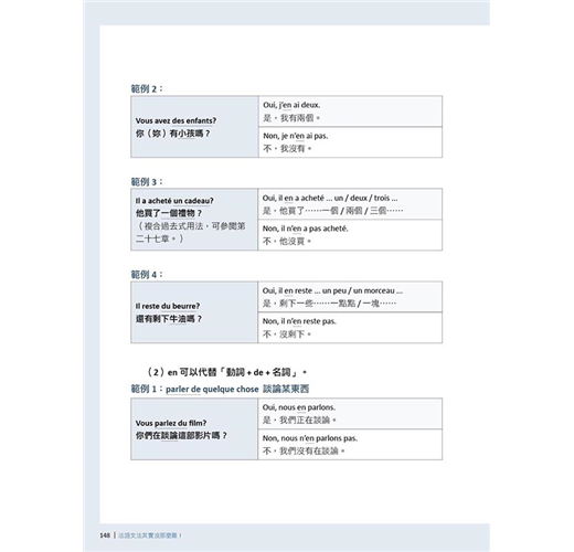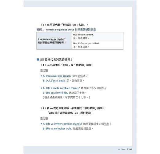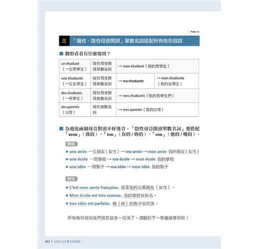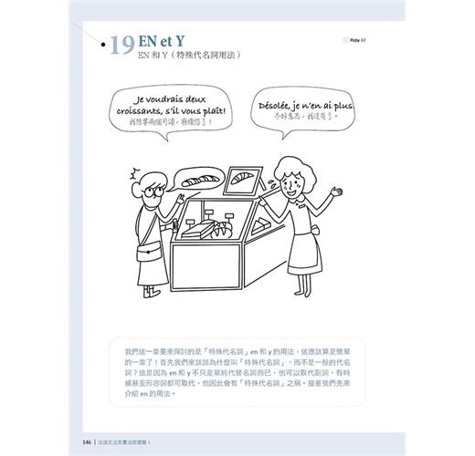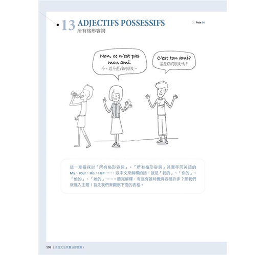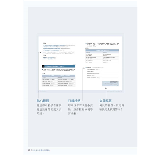 又,本書都是以對話的形式開頭,拿來作為學習每一章文法的開場白,希望讓學習者能了解到文法與日常對話之間息息相關。畢竟學習法語文法,就是為了能夠說出一句讓人可以理解又很漂亮的法語句子。