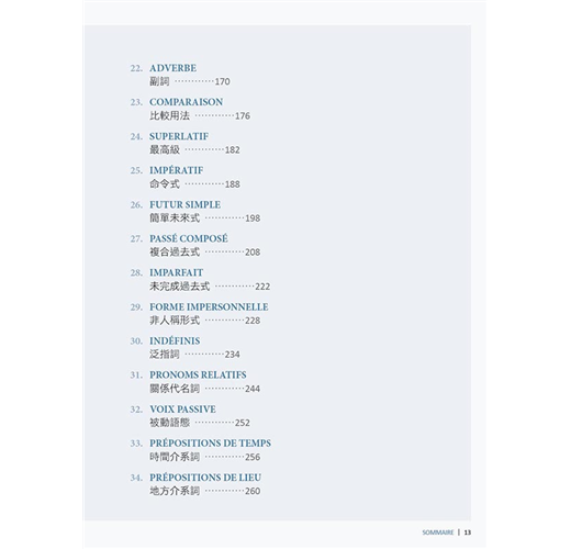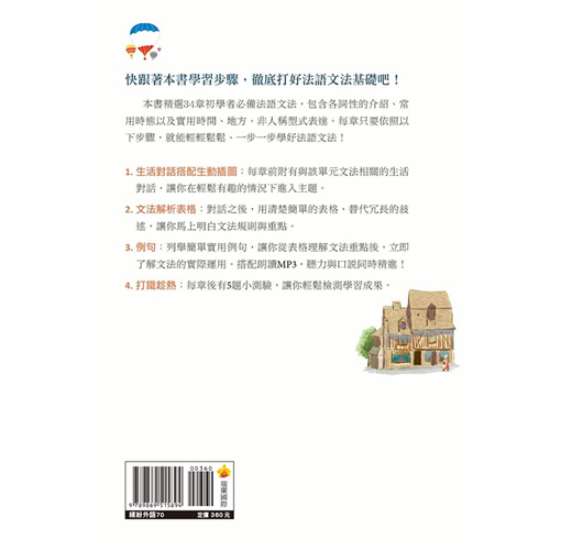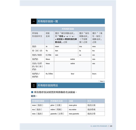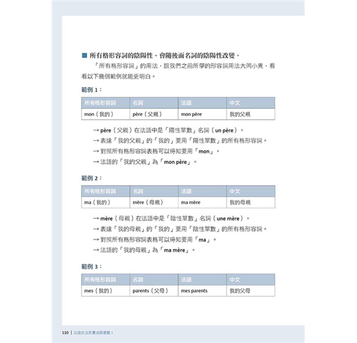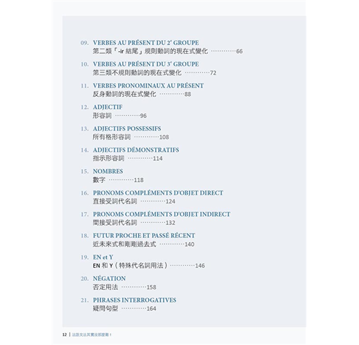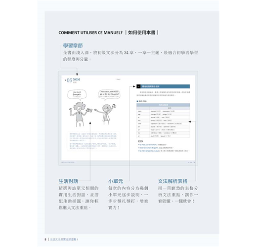 本書精選34章初學者必備法語文法,包含各詞性的介紹、常用時態以及實用時間、地方、非人稱型式表達,每章大致依照以下步驟設計,讓你輕鬆一步一步學習法語文法。