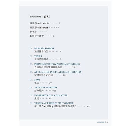這本教材是踏入法語文法的第一步。身為數個法語教學機構的老師,我會毫不猶豫地推薦此教材給初學法語的學生們。