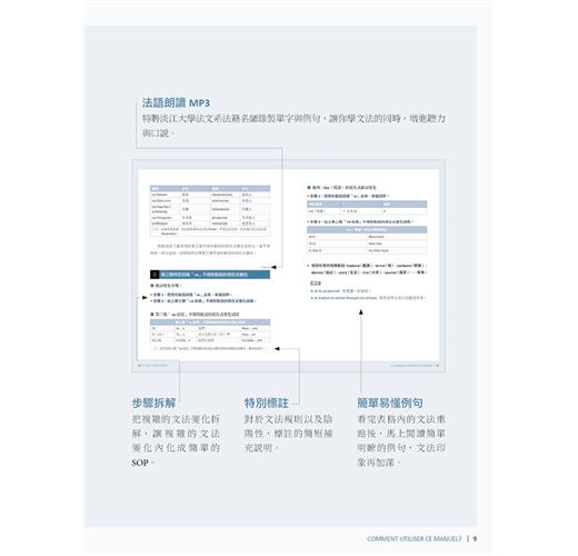 特聘母語為法語的淡江大學法文系名師錄製書中單字、例句。尤其所有例句,還有一快一慢兩種速度,快的讓你感受法國人真正的對話語感,慢的讓你掌握文法重點。只要跟著MP3學習,讓你學習文法的同時,還能精進聽力與口說,並馬上從法語人士的口說裡,應證書內文法重點!