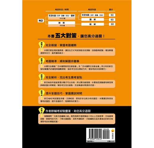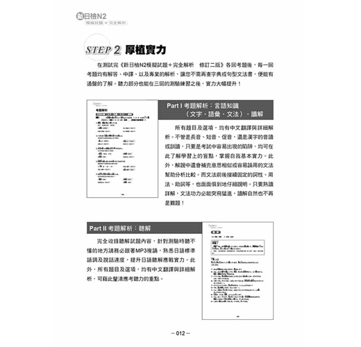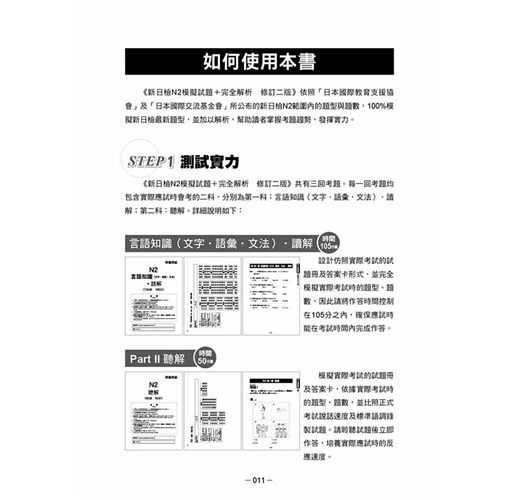1.本書由撰稿經驗十年以上的こんどうともこ老師,完全依據「日本國際教育支援協會」及「日本國際交流基金會」所公布的新日檢「最新題型」與「題數」出題。精準、活潑的考題,助您從容面對新日檢!