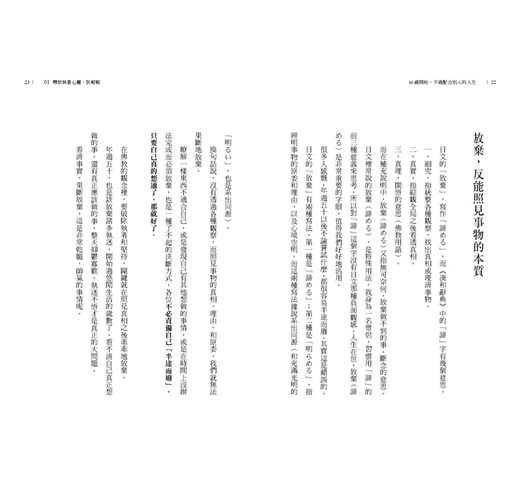 《練習不在意》、《般若心經,掃除內心》、《冷靜的生活方式》、《放棄我執》等等。