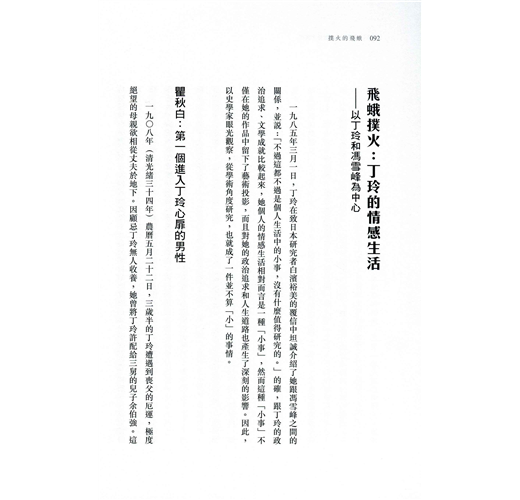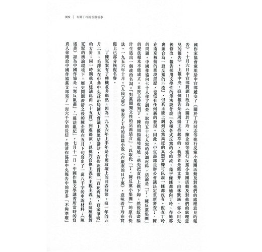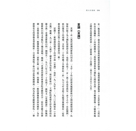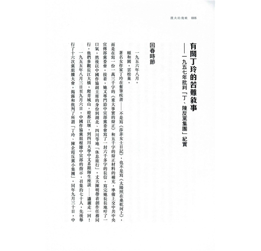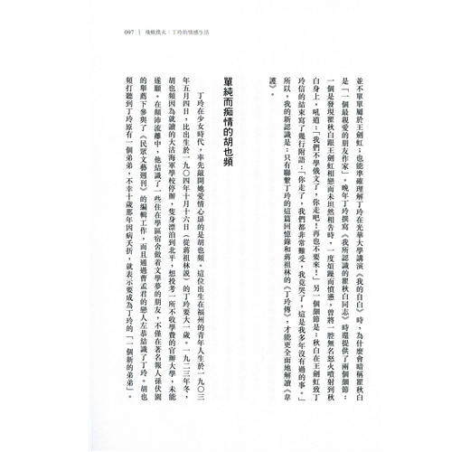 瞿秋白評價丁玲:「她是飛蛾撲火,非死不止。」這當然是指丁玲對理想、信念的不懈追求,但借用這句話來形容丁玲情感的熱烈和執著,也同樣貼切。追求光明,卻長達四十年被黑暗的陰影籠罩;熱烈地愛,又幾度因情感而遭受慘重創傷。才華橫溢,坎坷傳奇,丁玲的一生絕非幾個形容詞所能述說。---------------------作為當代著名文學家,丁玲一生充滿傳奇色彩,人們總結:文學、愛情和政治是她一生的三個主題。她猶如飛蛾投向光明一般,奔赴延安,從作家到中共文化幹部的歷程,她與馮雪峰、蕭軍的情緣,與沈從文從好友到友盡的公案,都是人們津津樂道的故事。與政治、政要緊密的聯繫,是她耀眼一時的重要因素,而這又同樣是她五十年代被打成右派、污為反黨集團首腦,陷落命運黑暗陷阱的緣由。當代文學史研究名家陳漱渝先生,爬梳剔抉,為讀者勾勒了丁玲跌宕起伏的一生。詳細敘述了其冤案始末,剖析了她和她生命中幾個重要人物的關係。作品考據詳實,文字淺白、通暢,是了解丁玲生平的一部佳作。