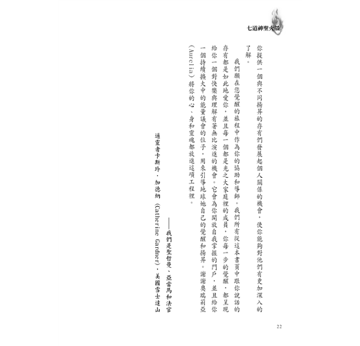 讀這本書,欲罷不能,愈讀愈興奮喜悅,是因為其中許多的教導,如七聖火燄(七道光)、紫色火燄、提昇火燄、電子、身體元素精靈等,都與擴大療癒法相互呼應,兩者殊途同歸,致力協助人類進入揚昇。