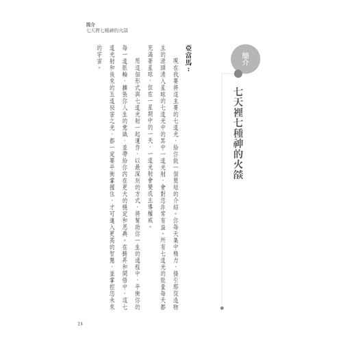 一周裡的七道光,每一道光都對應著專屬的大天使、古希伯來神以及與揚昇大師相關的屬性與活動。透過本書的帶領,你可以進行召喚和祈請,讓這些充滿神之愛和神之特質的火焰,開展你的領悟力,並在靜心之中連結你的「神我」和指導者,並允許這些能量灌注在你生命中的各個面向。