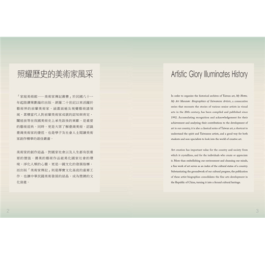 美術家的創作結晶,對國家社會以及人生都有很重要的價值。優美的藝術作品能美化國家社會的環境,淨化人類的心靈,更是一國文化的發展指標,而出版「美術家傳記」則是厚實文化基底的重要工作,也讓中華民國美術發展的結晶,成為豐饒的文化資產。