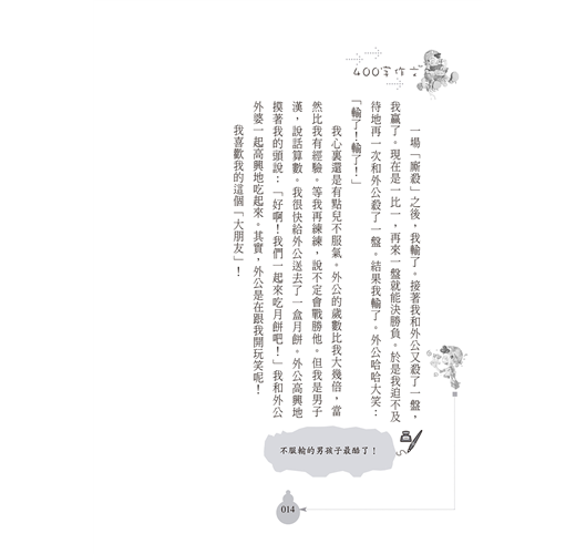 我心裏還是有點兒不服氣。外公的歲數比我大幾倍,當然比我有經驗。等我再練練,說不定會戰勝他。但我是男子漢,說話算數。我很快給外公送去了一盒月餅。外公高興地摸著我的頭說:「好啊!我們一起來吃月餅吧!」我和外公外婆一起高興地吃起來。其實,外公是在跟我開玩笑呢!
