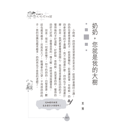 但奶奶仍然像以前一樣關心我。每次去奶奶家,她還是要帶著我買糖吃。雖然現在我望著奶奶,並不會覺得她好高、好大,但我還是要對她說:「奶奶,您還是我的大樹!您一輩子是我的大樹!」