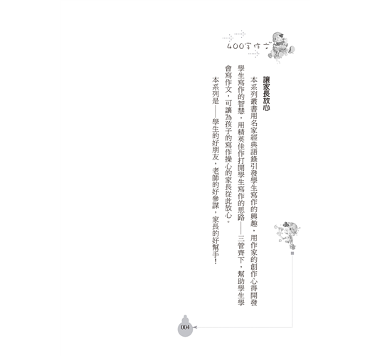 本書有最新的文章,最酷的點評,最炫的欄目,最能勾起孩子寫作慾望的作文。不僅得到了孩子、家長的喜愛,而且被眾多國文老師推崇為學習寫作的範本。是一本好玩有趣的400字作文。