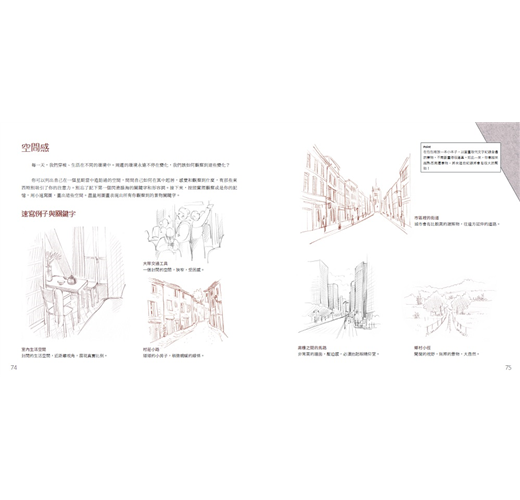 不同地點會傳達出不同的印象與個性。因為它們有不同的組成元素、歷史、生活方式、文化、空間使用方式等等。因此你可以試著解構那些空間,如此更能幫助你理解自己的感覺,進而更容易將它轉移到紙上。