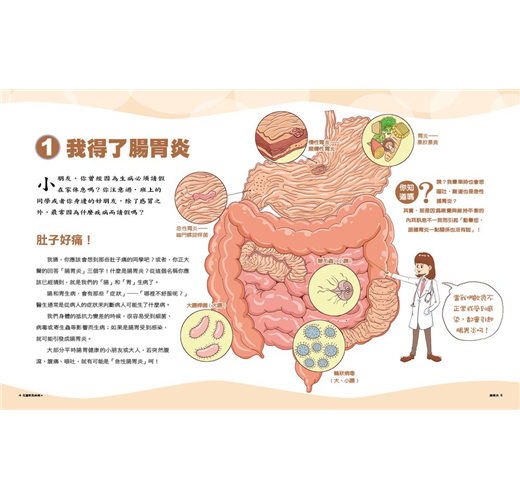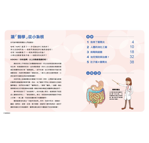 藉由簡單輕快的文字搭配趣味的插圖,寓教於樂的傳達正確醫學知識給小朋友;當孩子開心的看著有趣的插圖時,醫學知識也無形中鑽進孩子的記憶裡!