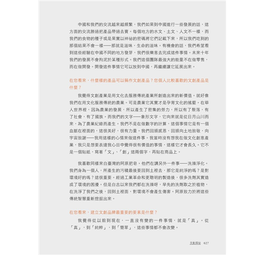 我覺得文創產業是用文化去服務傳統產業所創造出來的新價值。就好像我們在用文化服務傳統的農業。可是農業它其實才是孕育文化的搖籃。在華人世界裡,因為農業的發展,所以產生了密集的勞力,所以有了聚落,有了社會,有了國族。而我們的文字——象形文字,它向來就是從日月山川而來,為了農業紀錄而產生。我們不是在做數字的計算,這個事情它是有一個血脈在裡面的,這很美好,很有力量。我們回頭感恩,回頭向土地致敬,向宇宙致謝——我用這樣的心情來做這件事。我當時沒有想我在做文化創意產業,我只是想要表達我心目中覺得很有價值的事情,這樣它才會長久。它不是一個貼紙,寫著「文」、「創」這兩個字,再貼在商品上。