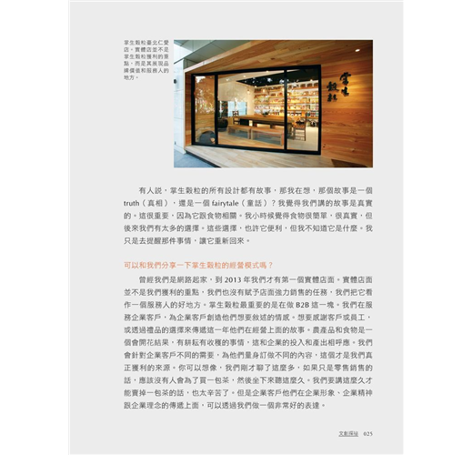 有人說,掌生穀粒的所有設計都有故事,那我在想,那個故事是一個truth(真相),還是一個fairytale(童話)?我覺得我們講的故事是真實的。這很重要,因為它跟食物相關。我小時候覺得食物很簡單,很真實,但後來我們有太多的選擇。這些選擇,也許它便利,但我不知道它是什麼。我只是去提醒那件事情,讓它重新回來。