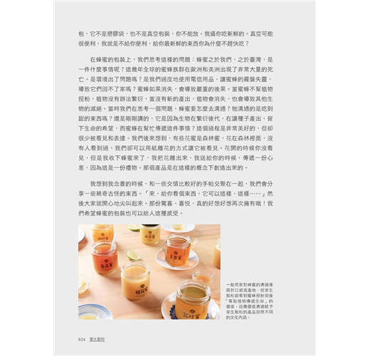 在蜂蜜的包裝上,我們思考這樣的問題:蜂蜜之於我們,之於臺灣,是一件什麼事情呢?這幾年全球的蜜蜂族群在歐洲和美洲出現了非常大量的死亡。是環境出了問題嗎?是我們過度地使用電信用品,讓蜜蜂的羅盤失靈,導致它們回不了家嗎?蜜蜂如果消失,會導致嚴重的後果。當蜜蜂不幫植物授粉,植物沒有辦法繁衍,當沒有新的產出,植物會消失,也會導致其他生物的滅絕。當時我們在思考一個問題,蜂蜜要怎麼去溝通?牠溝通的是吃到甜的東西嗎?還是剛剛講的,它是因為生物在繁衍後代,在讓種子產出,留下生命的希望,而蜜蜂在幫忙傳遞這件事情?這個過程是非常美好的,但卻很少被看見和表達。我們後來想到,有些花蜜是森林蜜,花在森林裡面,沒有人看到過,我們卻可以用紙雕花的方式讓它被看見。花開的時候你沒看見,但是我收下蜂蜜來了,我把花雕出來,我送給你的時候,傳遞一份心意,因為這是一份禮物。那個產品是在這樣的概念下創造出來的。