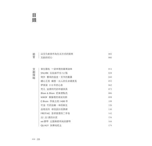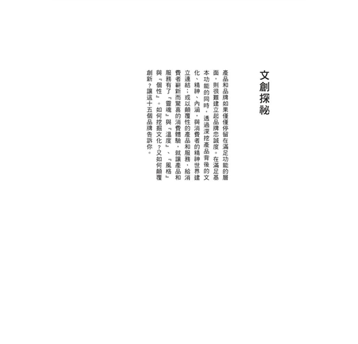 本書採訪了來自不同國家、地區的30 個文化創意品牌。它們備受不同民族、階層、語言文化人民的共同喜愛、推崇,也代表了當下文化創意產業發展的豐富樣貌。在本書中,品牌的創辦人(設計師、廣告人、媒體人、工匠藝人、普通人)以最大的真誠吐露心聲,與關注和喜愛文化創意品牌的讀者,一起回顧品牌創始的那些看似偶然卻又必然的機遇,講述其誕生的機緣與發展的故事,細數產品製作過程中經歷的挫折與喜悅,期待與更多人分享蘊含在產品、品牌中的生活理想。每一個品牌創辦人,既是文化的研究者、發掘者,更是文化內容的創造者。正如品物流形品牌創辦人、設計師張雷所言——「傳統在未來!」