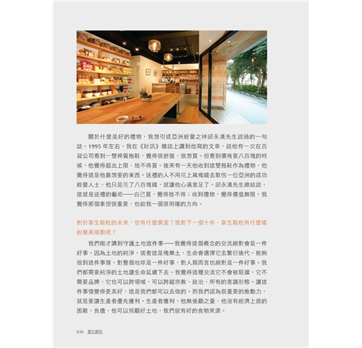 中國和我們的交流越來越頻繁,我們如果到中國進行一些發展的話,這方面的交流勝過把產品帶過去賣。每個地方的水文、土文、人文不一樣,而我們的食物的種子或是果實以神祕的密碼將它們記載下來,所以我們吃到的那個結果不會一樣——那就是滋味,生命的滋味。有機會的話,我們希望看到這些經驗在中國不同的地方發芽,我們很樂意去完成這件事情。未來十年我們的發展不會拘泥於某種形式。我們這個團隊最強大的能量不在做零售,而在做開發。開發這件事情它可以放到中國,再繼續讓它延展出來。