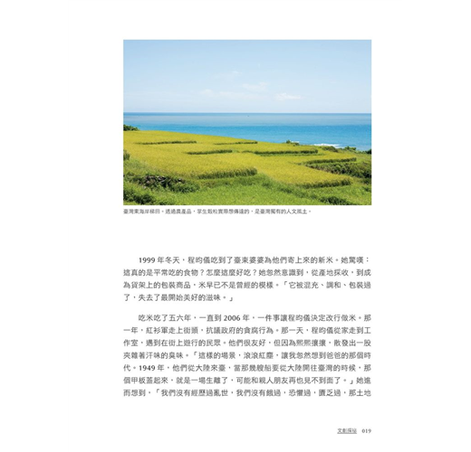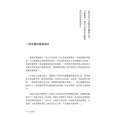 吃米吃了五六年,一直到2006 年,一件事讓程昀儀決定改行做米。那一年,紅衫軍走上街頭,抗議政府的貪腐行為。那一天,程昀儀從家走到工作室,遇到在街上遊行的民眾。他們很友好,但因為熙熙攘攘,散發出一股夾雜著汗味的臭味。「這樣的場景,滾滾紅塵,讓我忽然想到爸爸的那個時代。1949 年,他們從大陸來臺,當那幾艘船要從大陸開往臺灣的時候,那個甲板蓋起來,就是一場生離了,可能和親人朋友再也見不到面了。」她進而想到,「我們沒有經歷過亂世,我們沒有餓過,恐懼過,匱乏過,那土地上面一直擁有、一直產出的這些豐富美好的滋味,大家知不知道珍惜?有一天它會不會消失?」