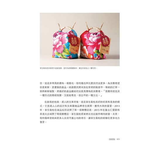 在創意的包裝、感人的文案背後,這是掌生穀粒美好的初衷和善良的模式。它直達人心的設計和文案圍繞品牌理念展開,獲得大家的喜愛。2013年,掌生穀粒在誠品松菸店開了第一個實體店面,2015 年在臺北仁愛路和香港太古城開了兩個實體店,掌生穀粒逐漸將目光從創作轉向經營。未來,程昀儀希望能與更多人交流守護土地的理念,讓掌生穀粒的經驗在更多地方發芽。
