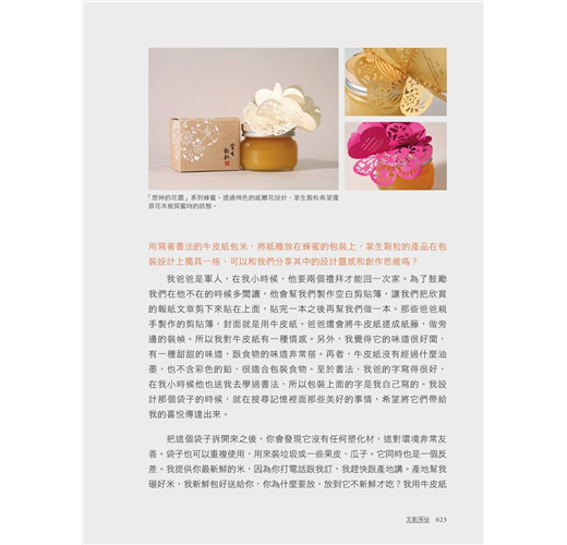Q:用寫著書法的牛皮紙包米,將紙雕放在蜂蜜的包裝上,掌生穀粒的產品在包裝設計上獨具一格,可以和我們分享其中的設計靈感和創作思維嗎?