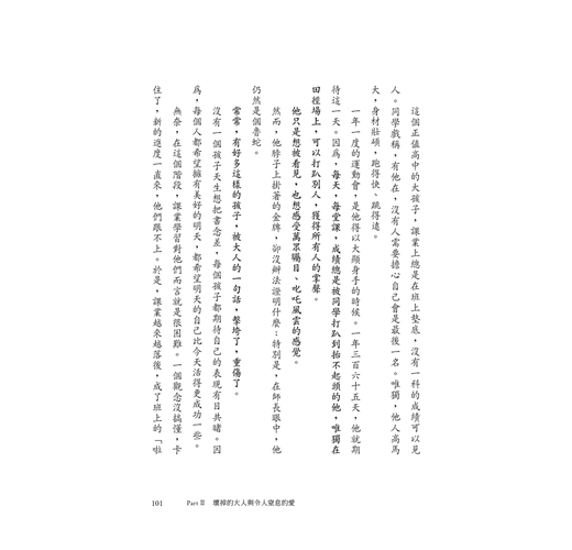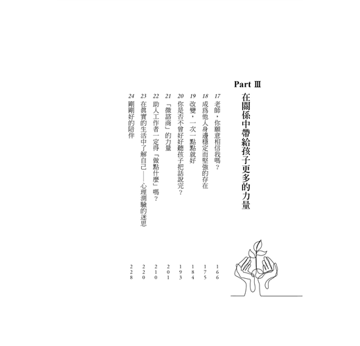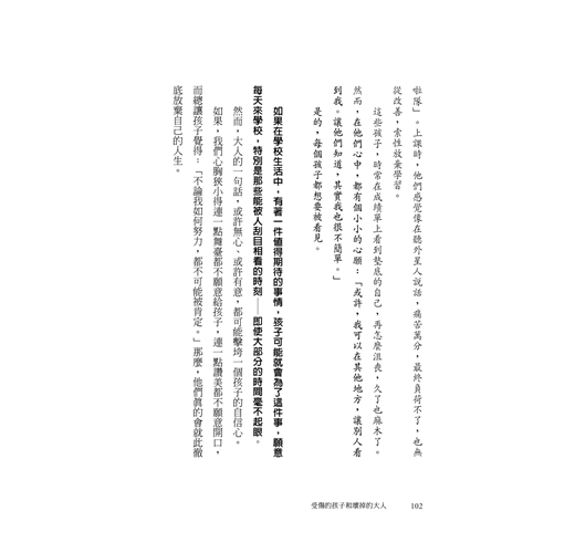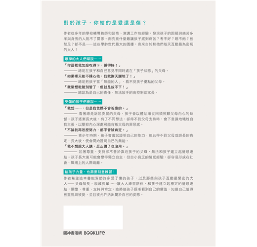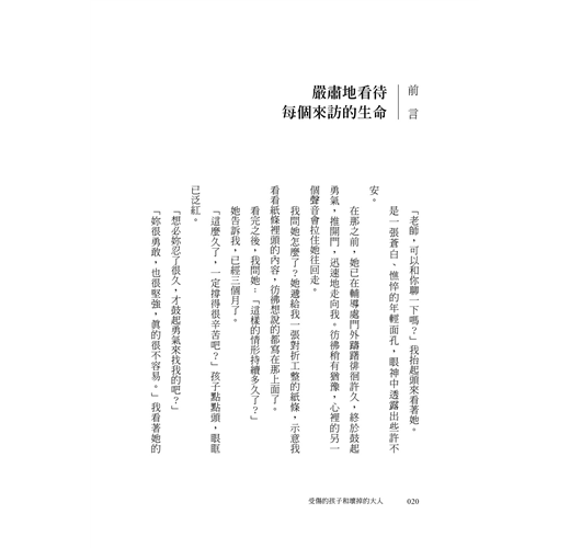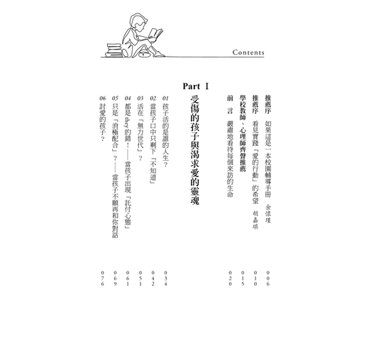 一本助人工作者溫暖的專業書寫。不管是受傷的孩子,抑或對教養、教育充滿困惑挫折的大人,相信都能從書中得到啟發與助益。