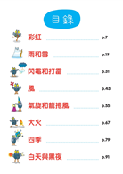 本書共分為8個章節,包括彩虹、雨和雪、閃電和打雷、風、氣旋和龍捲風、大火、四季及白天與黑夜。