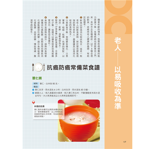 針對老人、上班族、男性、女性和孩童精心規劃抗癌菜單,遠離癌症。