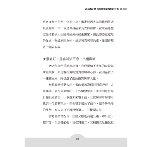 1999年加州房地產起飛,我們累積了多年的存款為購屋頭款,與房客相處的寶貴經驗和心得,在同區買了一棟獨立屋,同樣選了兩位優質房客入住。