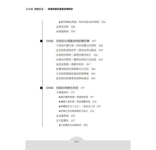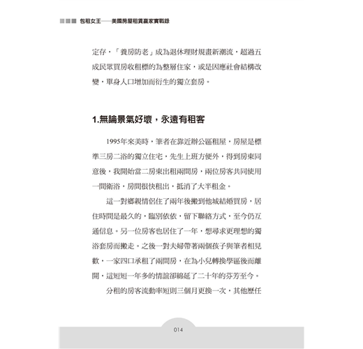 這20年的包租生涯說來漫長,成長的房客數量和經驗可說洋洋灑灑,但和我母親這位八十高齡、經營出租長達近半世紀的包租教母相比,我仍是後生小輩,要學習、經歷的事還多著呢,容不得我輕忽懈怠。這多年的心得累積,現稱得上倒吃甘蔗,足夠讓我「一招半式闖美國」,在自營包租之外,還行有餘力幫朋友及介紹包租管理,但「租到老學到老」,遇上新鮮事,又可訓練為人處事的方法,讓思想、言語更圓融,真的是包租工作的最大價值。