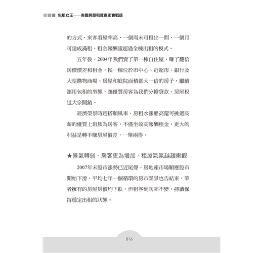 擁有二十多年美國房屋租賃經驗的MIA,把握住每次景氣循環的機會增加財富,買房包租,以租養貸,每月除了有穩定的租金收益,同時靜待房地產的增值。