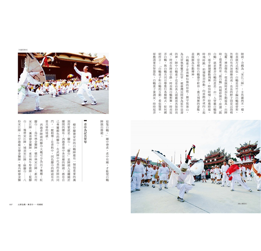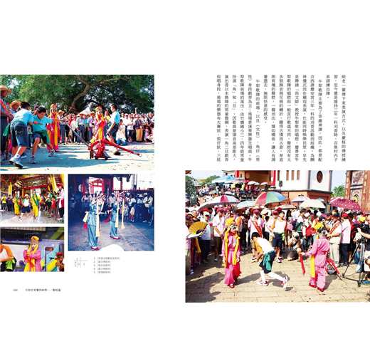 本書的內容非常多元而精彩,藝陣團體依序包含:「全台白龍庵如意增壽堂什家將」、「七股樹仔腳寶安宮白鶴陣」、「新營土庫土安宮竹馬陣」、「七股竹橋慶善宮牛犁歌」、「學甲慈濟宮謝姓金獅陣」、「新化鎮狩宮吳敬堂官將首」、「六甲泰山民俗技藝團」、「海寮普陀寺南樂清和社」等,八個藝陣團體與藝師。其中「文陣」有:「海寮普陀寺清和社」、「土庫土安宮竹馬陣」、「七股竹橋慶善宮牛犁歌」三團;「武陣」有:「白龍庵如意增壽堂什家將」、「新化鎮狩宮官將首」、「七股寶安宮白鶴陣」、「學甲謝姓獅團」等四團;而「六甲泰山民俗技藝團」則是文武陣兼具的表演陣頭。