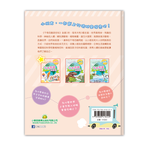 一連串的千奇百趣問題,以小朋友和大人你問我答的方式,介紹世界各地的多元文化,培養小朋友的國際視野;日常生活接觸到或常聽見的科學和動植物百科,增加孩子的科普知識;探索人體的奧祕更能讓他們了解自己。