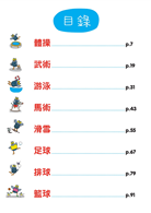 本書共分為8個章節,包括體操、武術、游泳、馬術、滑雪、足球、排球及籃球。