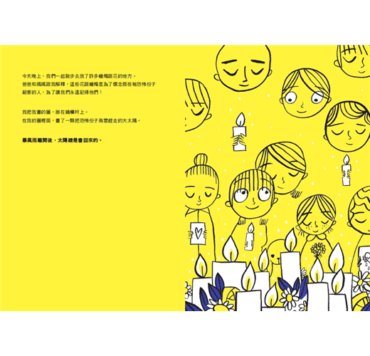 文字敘述有其學理背景,視覺圖像也搭配得巧妙。此書繪圖一反文字的寫實風格,反採大膽的兒童畫風格,隨文字聚焦在某些抽象情緒上,避開寫實殘酷的恐攻場面。插畫家戴伊只用三色就為三種關鍵的情緒定調:藍色是脆弱與不安;黑色代表恐懼與絕望;黃色則是溫暖與希望。隨著劇情的轉換,最後一頁配圖是眾人浸潤在飽滿的「黃光」裡,如同經歷一場諮商治療。