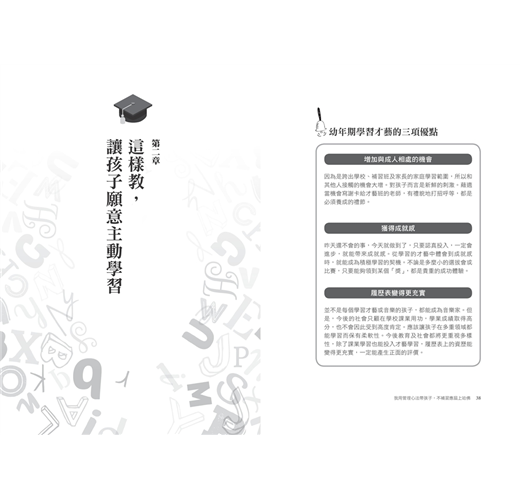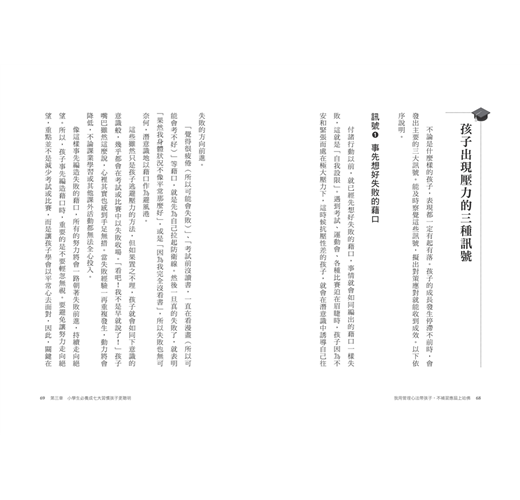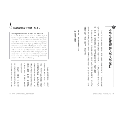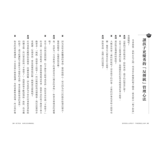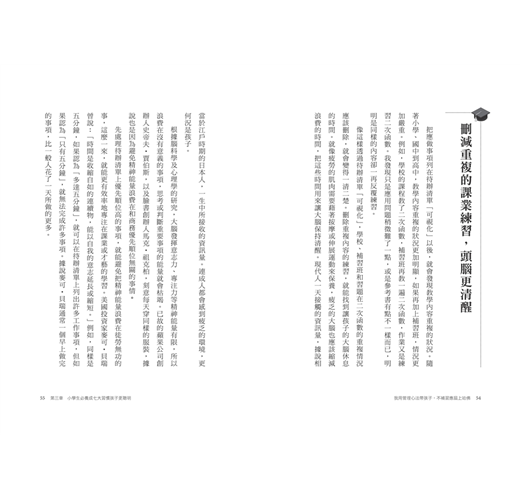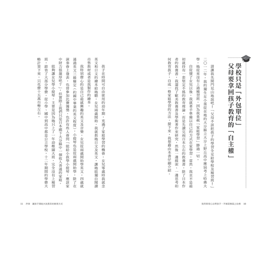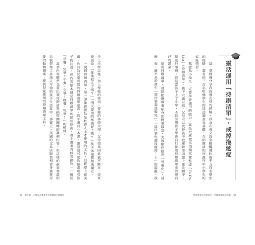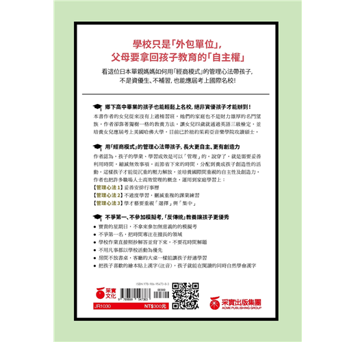 作者也認為,孩子的學業、學習成效是可以「管理」的。說穿了,就是需要妥善利用時間,縮減無效事項,而節省下來的時間,分配到養成孩子創造性的活動,這樣孩子才能從沉重的壓力解放,並培養國際間重視的自主性及創造力。