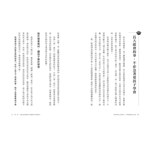 孩子在時間可自由使用的幼年期,充滿家庭學習的機會。我在女兒零歲時就「讀」英文和日文的繪本給她聽,女兒兩歲開始,我就教她日文及英文,讓她能獨自閱讀市售教材或者是我製作的繪本。