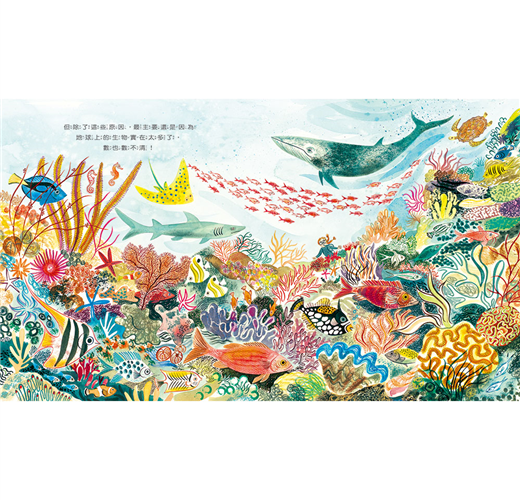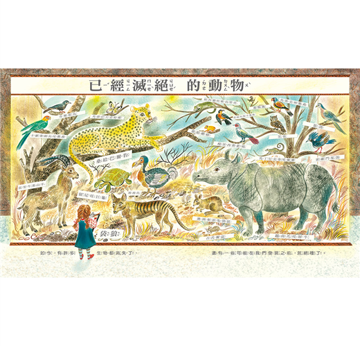 一翻頁,滅絕動物的博物館畫面赫然出現眼前,那些如同標本般的動物,令人讚嘆卻又無限惋惜,不禁思考起人和其他生物間的關係。人類到底是和萬物互相依存,還是大自然的破壞者?當你聽到「我們只有一個地球」時,可曾想過這裡的「我們」,除了人類以外,還包括了其他兩百萬種不同的生物?