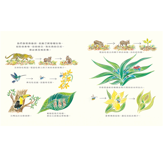 沙漠中、深海底,或是滾燙的溫泉裡…你想得到或是想不到的地方,到處都有動物或植物,而且每種生物從吃的食物、住的地方,到生長的方式,都必須互相依靠才能生存!